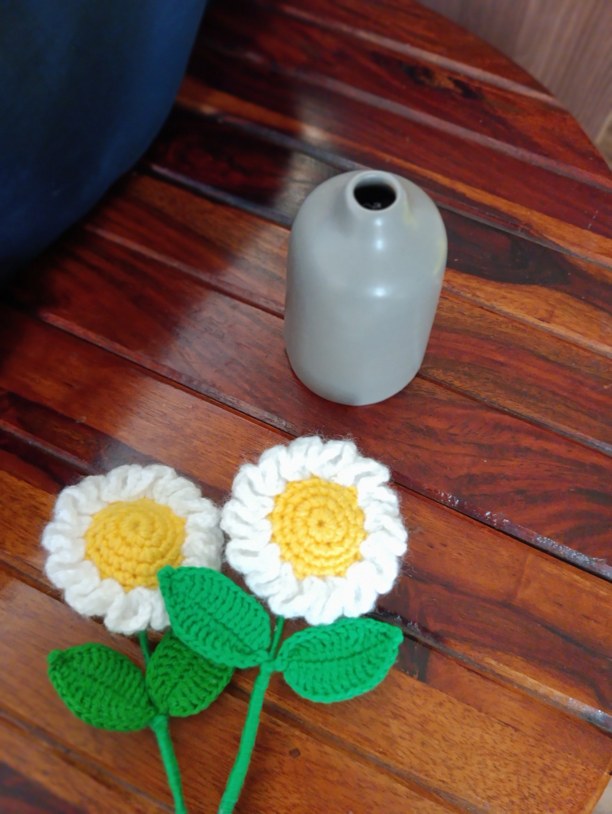 - Handcrafted Daisy in ceramic POT: These delightful flowers are meticulously crocheted by skilled artisans, showcasing their remarkable craftsmanship. Flower: handmade crochet Daisies Mini Pot Product: Product Breadth : 6 cm Product Height : 11 cm Net Quantity (1N)